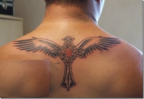Cruz Tatuajes tienen sus propios significados y símbolos. Usted puede utilizar cruz tatuajes con diseños de mezcla de algunos otros diseños, como se muestra en esta imagen.En esta imagen podemos ver un Tribal alas de la cruz tatuajes de diseño.